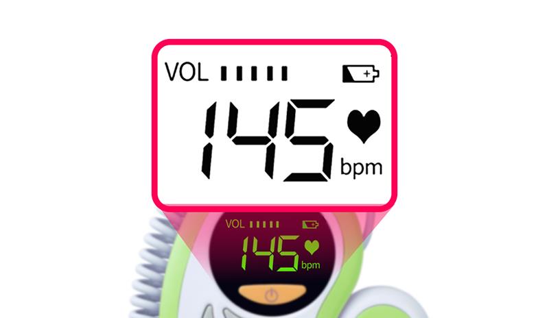 LED podsvícený displej, intuitivnější porozumění srdeční frekvenci plodu, nastavitelná hlasitost, poslech srdečního rytmu dítěte